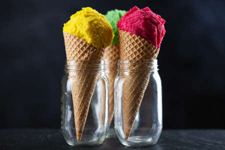 Set of tasty ice-cream cones on dark background