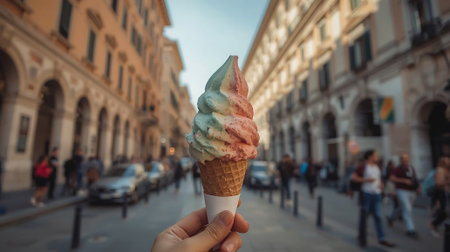 A hand holding a cone of Italian gelato with two colorful scoops, strawberry and pistachio, in the middle of a sunny street in Rome