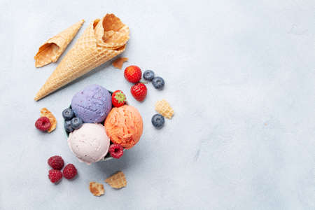 Various of ice cream flavor with fresh blueberry, strawberry, raspberry, chocolate, vanilla setup on rustic background . Summer and Sweet ice cream