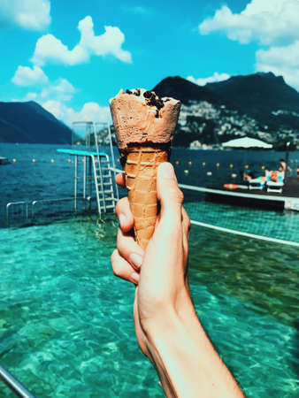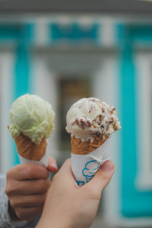 Tasty gelato in waffle cone, pistachio and triple chocolate ice cream scoops. Amazing treat during hot summer in town