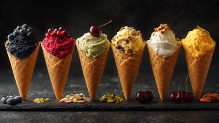 Assorted ice cream cones with fresh fruits and nuts on slate platter.