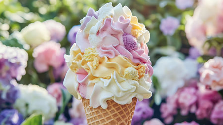 Delightful ice cream cone topped with colorful swirls in a floral garden setting
