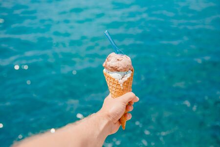 Tasty ice cream in hand on the background the turquoise sea.