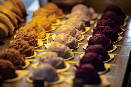 Assortment of colorful gelato on cafe showcase