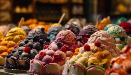 Multi colored berry dessert with fresh fruit and homemade ice cream generated by artificial intelligence