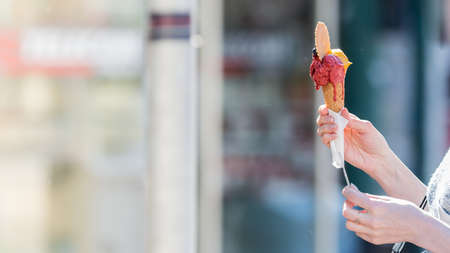 Young woman hands holding ice cream cones on summer day in the city. Tasty colorful fruit and berry ice cream