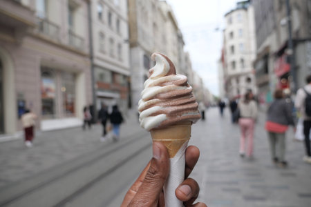 Enjoying swirled ice cream in a lively city street