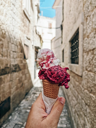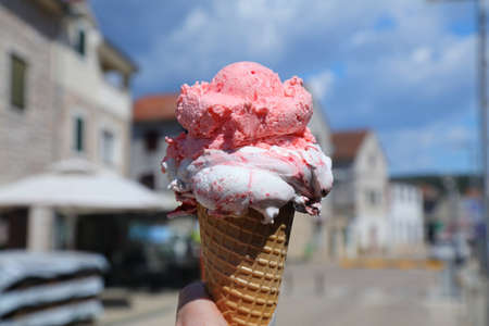 Croatia ice cream - holding fruit ice cream in Pirovac resort town.