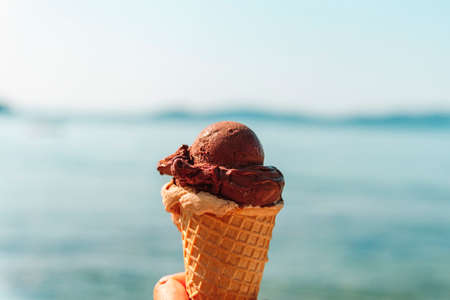 Scoop ice cream with a waffle cone in hand on the beach, sunset moment.