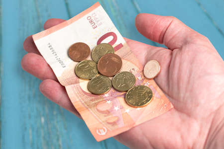 hand holding 10 Euro bill and small change against blue wooden table background