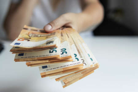 woman hands giving money like a bribe or tips. Holding EURO banknotes on a blurred background, EU currency