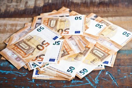 Pile of fifty euro banknotes. Currency bank notes stacked on rustic wooden table background closeup.