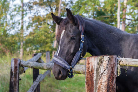 One adult black stallion with white spot on head is standing behind fence, looking carefully ahead and watching. Horse portrait. Country life in fresh air and horse farm with thoroughbred stallions.