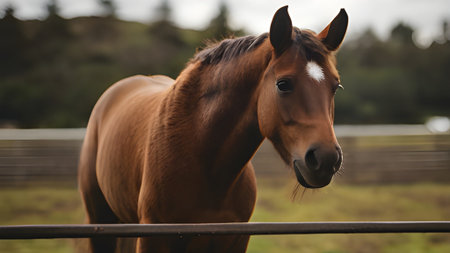 A close-up of a chestnut horse standing by a black wooden fence with a backdrop of autumn foliage in soft focus. the serene and idyllic setting emphasizes the horse's gentle expression and the warm, earthy tones of the fall season. Generative AI