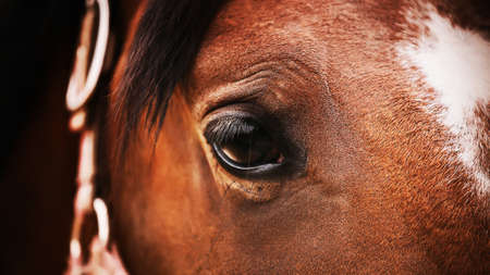 The eyes of a bay horse with a black mane close-up, illuminated by daylight. Livestock.