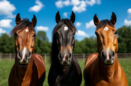 A Three horses of different colors stand in summer landscape, showcasing their beauty against bright blue sky. scene captures essence of nature and tranquility