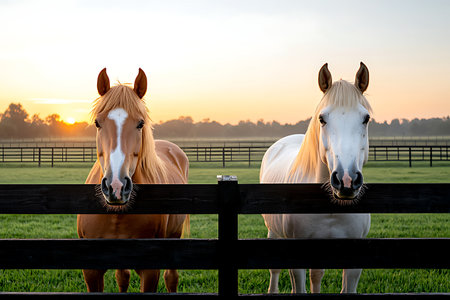 Two beautiful horses, one brown and one white, stand close at a wooden fence during sunrise, surrounded by lush green grass and a tranquil landscape.