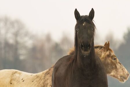 Two horses, black and white horse, animals life, white edit space