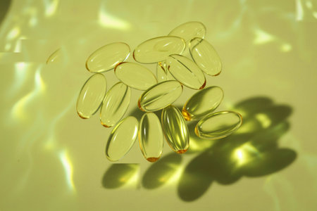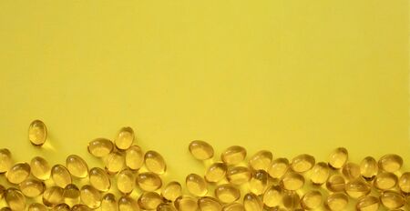 close up view of golden shiny fish oil capsules scattered on yellow bright background