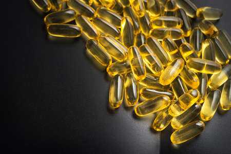 Vitamin D3 capsules. Medicine vitamins and dietary supplements. selective focus. Close up of oil filled capsules suitable for: fish oil, omega 3, omega 6, omega 9, vitamin A, vitamin D, vitamin D3, vitamin E