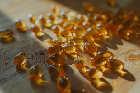 Close-up of capsule goldens glowing with light, symbolizing health and vitality. Ideal for pharmaceutical ads, health supplement branding, or nutrition education.