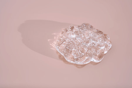Hyaluronic acid serum texture. Beauty skin care liquid gel on pastel pink background. Clear cosmetic cream with bubbles closeup. Top view, flat lay