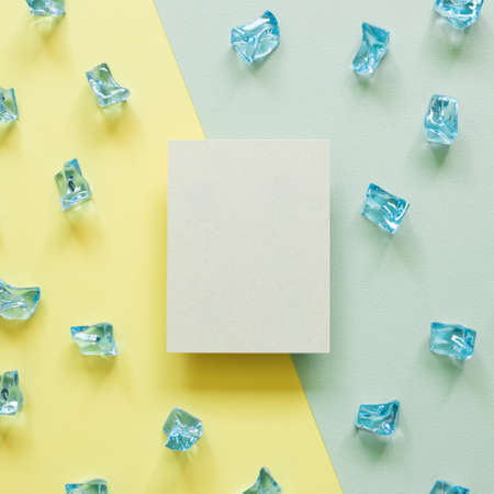 Blank memo pad with ice cubes on green and yellow background. top view, copy space