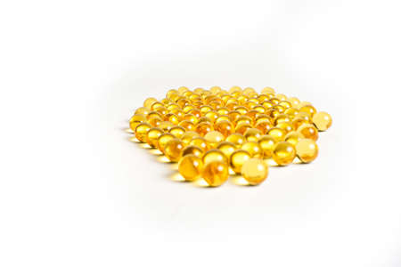 Fish oil pills in a golden jelly shell on a white background.