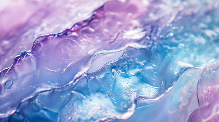 Hyaluronic acid texture, cosmetic product closeup with tiny bubbles. Glycerin or gel smear smudge swatch on lilac backdrop with shadow. Styling gel, lotion, cleanser, transparent shampoo drop. Macro