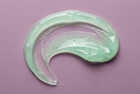 Top view of a curved smear of translucent mint green cosmetic gel with air bubbles texture on a smooth matte purple background for hygiene and skincare concepts.