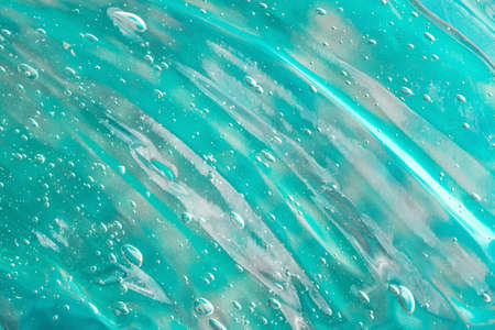 Background from cosmetic gel with bubbles,dripping down.Top view,antibacterial liquid surface.Good as background or mockup.