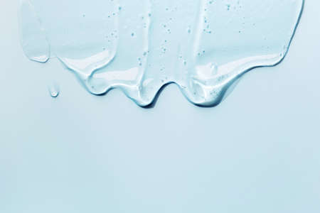 Liquid gel cosmetic on blue. Texture of liquid gel or sanitizer on blue background. Pattern of transparent gel for face cleansing. Moisturizing cosmetic beauty product for skincare. Lotion or serum for dry skin care