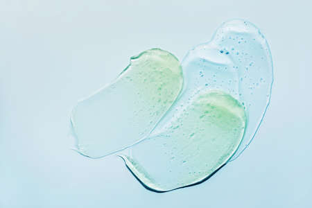 Liquid abstract cosmetic gel smears on blue background. Smear of transparent moisturizing product