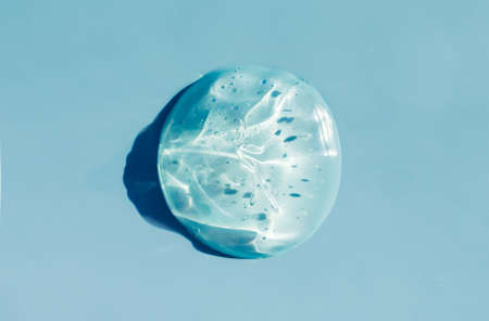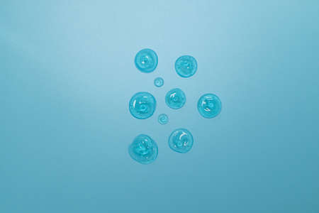 Texture of transparent antiseptic gel with air bubbles on blue background. Summer ocean imitation. Concept of skin moisturizing, prevention of virus. Liquid beauty product closeup. Backdrop, flat lay
