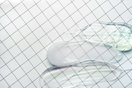 Cosmetic gel, serum swatches. Gel texture. Clear cosmetic liquid drop. Transparent skincare product with bubbles sample. Close up.
