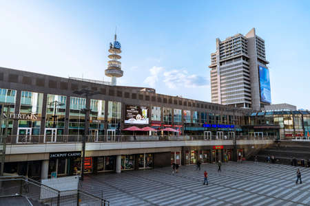 Hanover, Germany - August 19, 2019: Raschplatz, pedestrian square with people around and the VW-Tower, telecommunications tower in Hanover, Germany