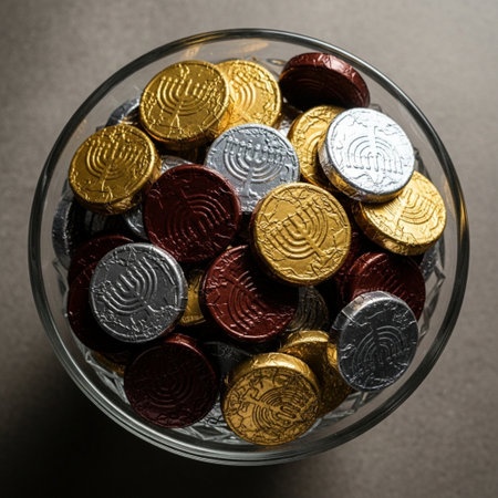 Jewish holiday Hanukkah with gold coins on a wooden table