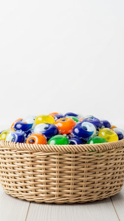 Laundry detergent pods for washing machine in a mini shopping basket. Three in one eco gel capsules.