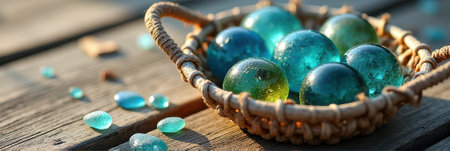 Basket of glass marbles in sunlight on wooden surface.