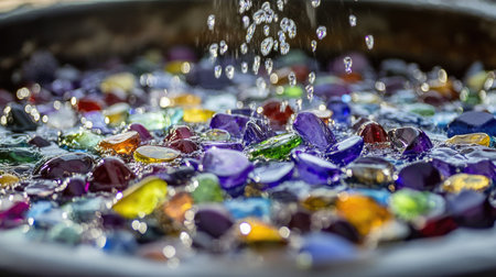 A stunning view of colorful gemstones submerged in a gentle stream of water, creating a serene and captivating atmosphere for relaxation and beauty.
