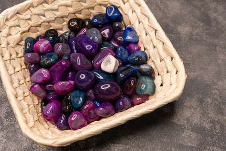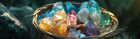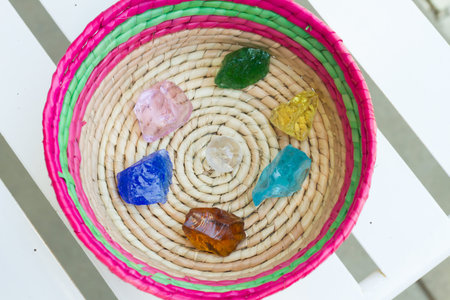 Assortment of colorful natural crystal gemstones in woven basket