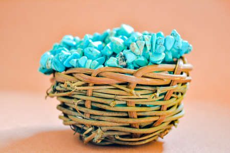 Pile stones of raw Turquoise in small wooden nest on a brown background. Blue and green color stones set. Collection of minerals and natural stones. Heap of stones