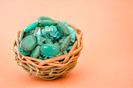 Pile stones of raw Turquoise in small wooden nest on a wine red background. Blue and green color stones set. Collection of minerals and natural stones. Heap of stones