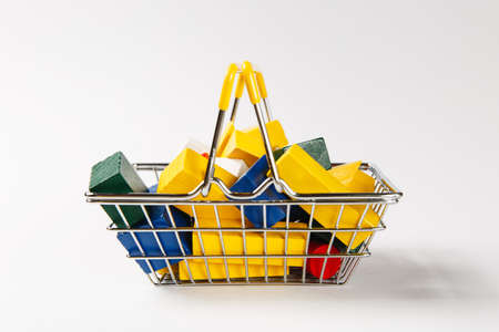 Close up of grocery basket for shopping in supermarket with yellow handles filled with multi-colored geometric shapes isolated on white background. Concept of shopping. Copy space for advertisement.