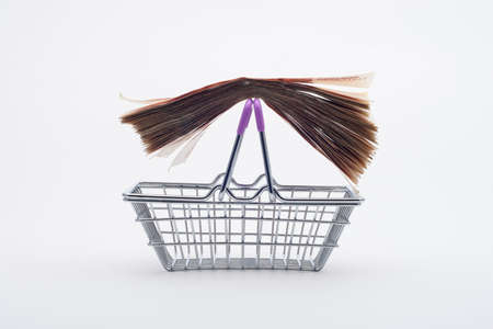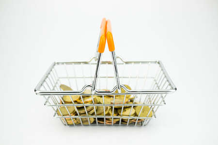 stacks of different coins inside of shopping basket on white background shot at shallow depth of field with minimalist composition, concept of expenses and consumer behaviour