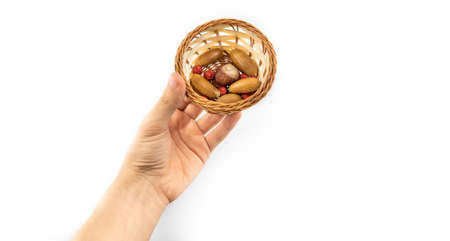 In a basket that is woven from a vine, there are also woven from a vine and cone of coniferous trees. Between them is a small box packed with a gift ribbon. The gift is waiting for the owner.