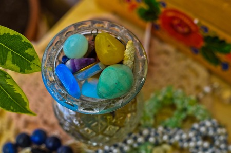 Colorful semiprecious stones in a glass vase. closeup