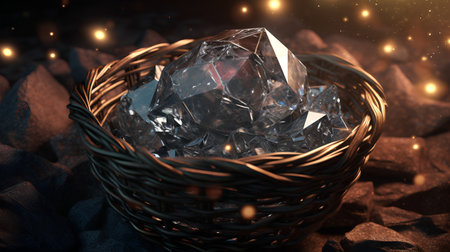 diamonds in a basket on a black background. 3d rendering