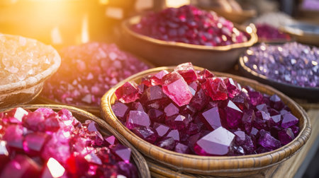 Vibrant gemstones displayed in baskets at a market under warm sunlight