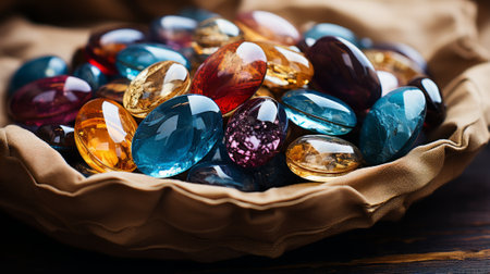 AI Generated. Assortment of colorful gemstones and crystals on wooden plate
